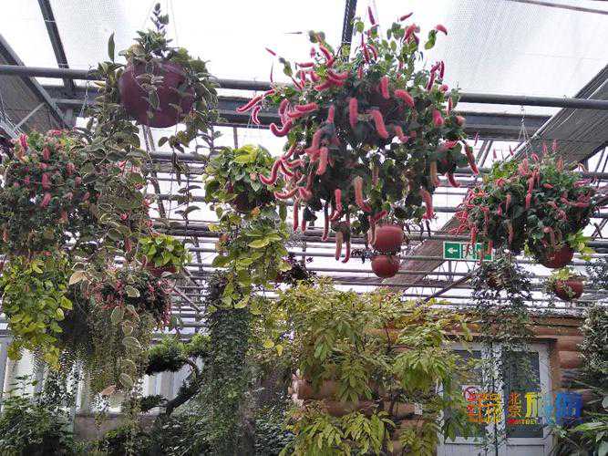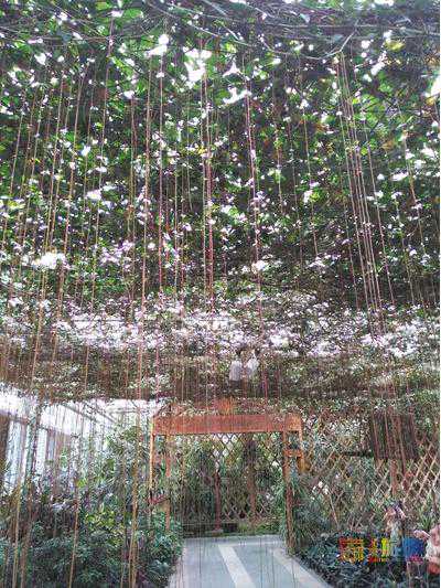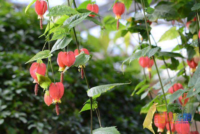 参观完沙漠植物馆,就到了茗赏百花厅,顾名思义,这里可以品茶,可以小憩,更可以赏花。举目四望,上上下下全是花草,尤其是挂在上面的花会吸引你的注意力。其中最令人移不开眼的是宫灯吊兰,学名红萼苘麻,其花型酷似传统宫灯,红红的小灯笼下面黄色的花蕊酷似灯笼穗,如果你乍一看到,肯定不会想到这是鲜花,非常喜庆。其实,在前面的蔬菜瓜果厅里,这些小灯笼就露过面了,不过,在那个厅里它不是主角。