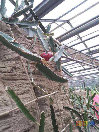 在沙漠植物馆,还能见到你长吃的一种水果——火龙果。你能想象平常吃的火龙果的植物也是类似仙掌一样的植物吗?绿色的、长长的、肉质藤茎上就那样凭空结出了一个果子,最初是绿色的,成熟的时候就是你在超市里常见的玫红色了。我去的时候,只看到了一个红色的果子,绿色的倒是有好几个,也许你去参观的时候,比较幸运,那些绿色的果实都变成了红色。