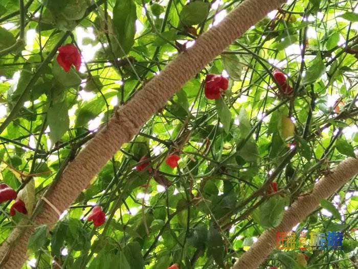 火龙果雕塑后面的藤蔓上结满了还没成熟的火龙果