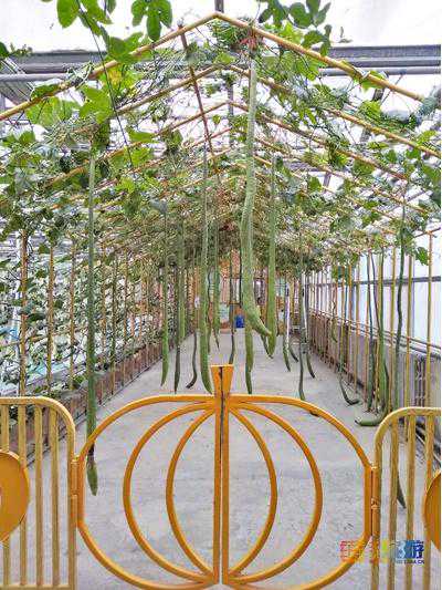 继续往前走几米,路的左侧就能看到第二个温室——蔬菜瓜果园的入口了。一进这个温室的大门,就能看到金黄色的“巨人南瓜”。温室内的蔬菜瓜果都是颜值特别高,有就像长着五个指头一样的五指茄,白色的茄子、各种葫芦、有长达1米左右的老鼠瓜,像迷你降落伞一样的鲜红色辣椒、还有红红的大萝卜,已经成熟咧开了嘴的棉花。