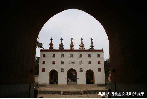 五塔门位于普陀宗乘之庙碑亭以北。五塔自西向东分别为红、绿、黄、白、黑,塔身装饰分别为莲花、宝剑、宝贝、法轮、金刚杵。5种颜色以及塔身装饰分别代表着藏传佛教的五大支派及佛教中的五方佛。寓意着佛法无边、慈惠及众生,带给从此过往的人们以幸福、安宁。