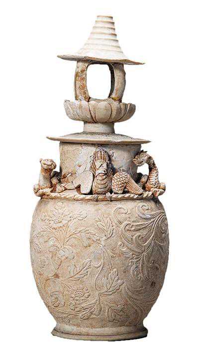 宋代青白釉刻花堆塑龙虎盖瓶。