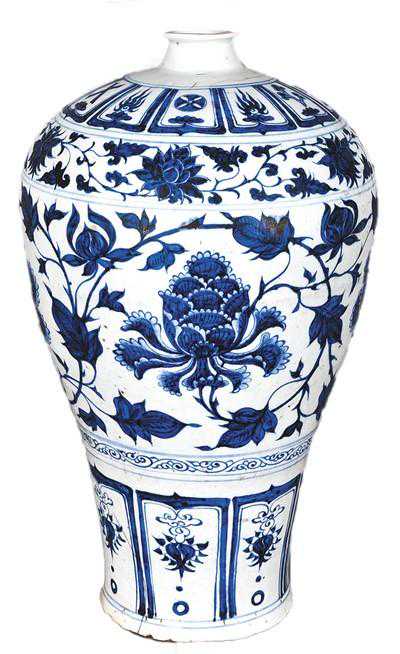 这件元青花梅瓶器形比宋代梅瓶更加硕大,烧制方法为“二元配方法”,在瓷石中加入高岭土,提高了烧成温度,降低了器物变形的风险。这种方法的发明,开创了中国制瓷史上烧制大件瓷器的新篇章。元青花瓷器的造型、使用功能与蒙古族和西亚诸民族的生活方式有密切联系,在中外文化交流史上占有重要地位。