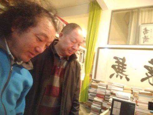(刘连喜中央电视台发展硏究中心副主任、高级编辑向我介绍孟昭俊先生在北京书法展会上的作品。)