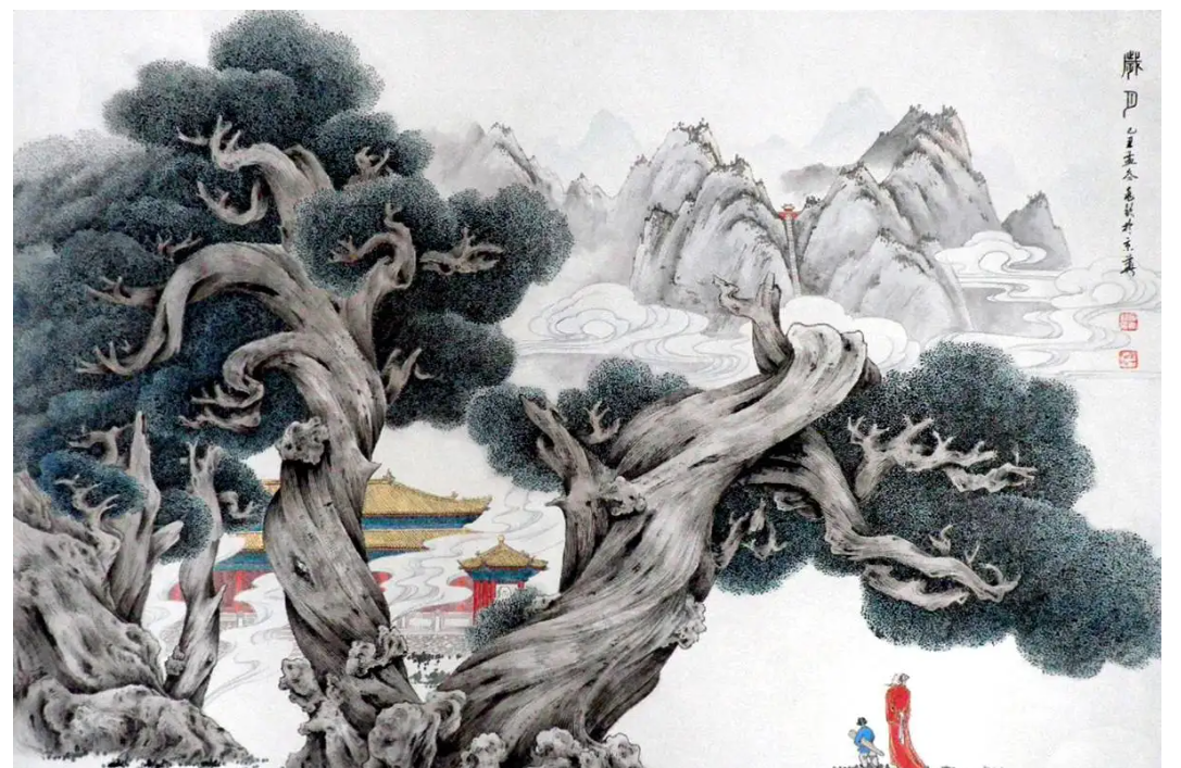 宋兆钦擅长青绿山水,画风在继承传统的基础上推陈出新,将工笔与写意相结合,艺术风韵独特,金碧为纹的山水画,设色富丽,极具装饰性。其红船井冈山系列作品则展现了他作为一个从小深受红色文化熏染的老一辈艺术家的坚守。