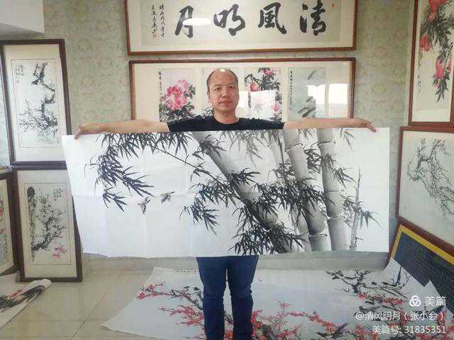 看他的梅兰竹菊,雅韵清气扑面而来,特别是竹叶远近,墨色的变化,层次分明,栩栩如生,或粗竹节高,苍劲挺拔,有跃出纸面的感觉和物体的质感。