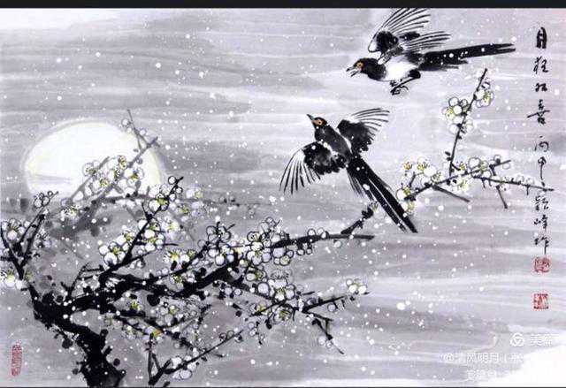 毋颖峰老师笔下无论是白梅、黄梅、还是红梅都暗香浮动,清雅脱俗。再加上八(同发)只黑白相间,形态各异的喜鹊,或振翅高飞,或收翅下落,或立于梅枝凝眸对视,或立于梅丛石上回首鸣叫喧闹于梅间,远处朦胧青山隐约可见,喜鹊闹红梅,怪石、几丛白玉兰一枝小竹相映成趣,动静结合,层次分明,美好喜庆之意跃然纸上!