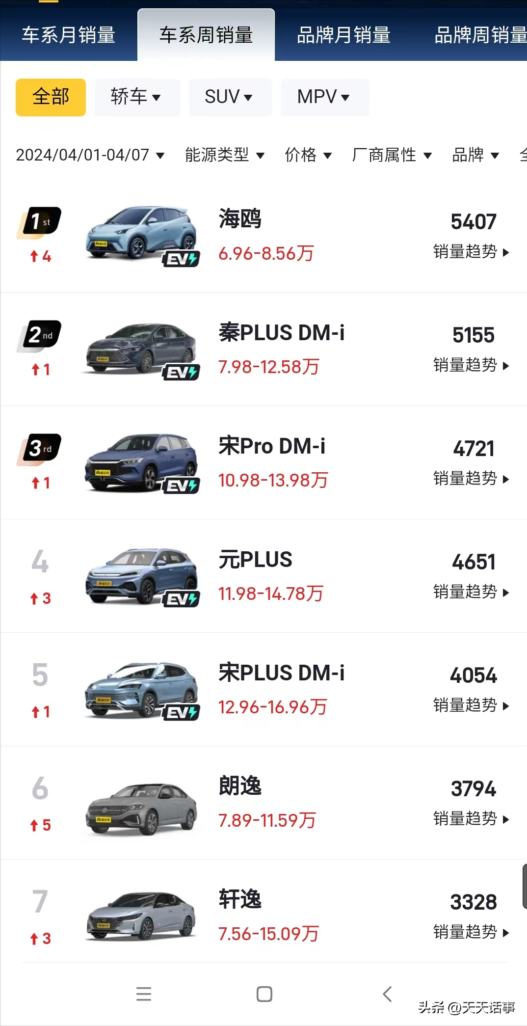 4月第一周汽车销售榜单出炉,海鸥登顶,小米SU7只排在75位