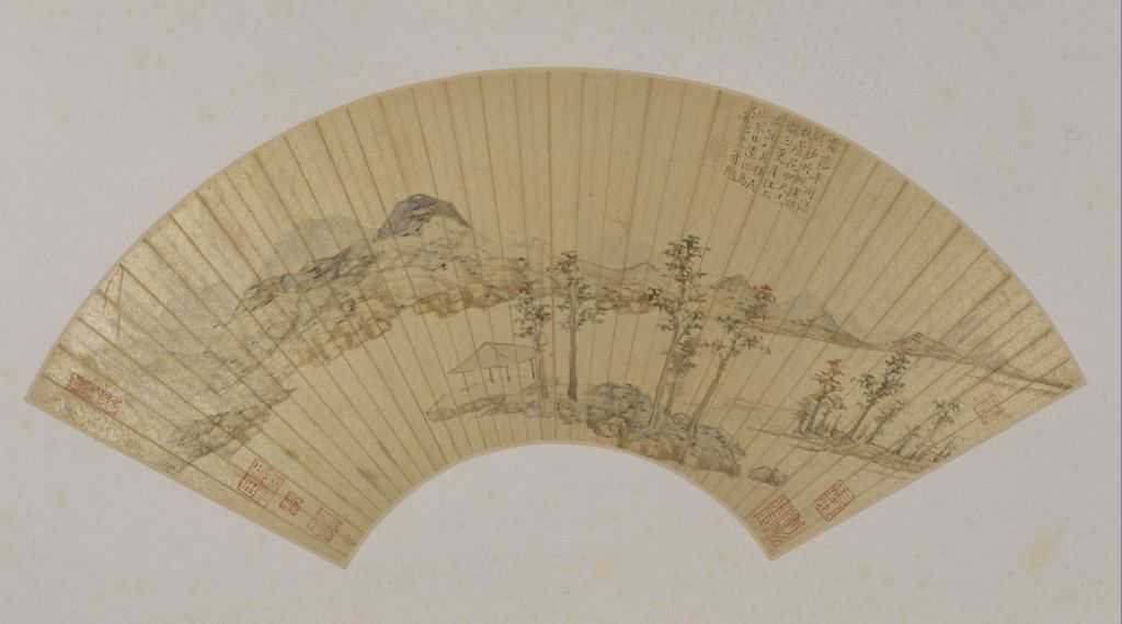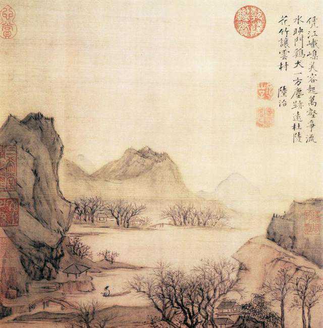 此图一河两岸式的构图仿自元人倪瓒。山石、树木的画法则完全是陆治绘画艺术成熟时期的风貌,其山石用笔秀挺,以花青、赭石平抹涂染为主,较少皴擦;树叶以红、绿色点染,笔法灵动,显现出树木生机勃勃的朝气。