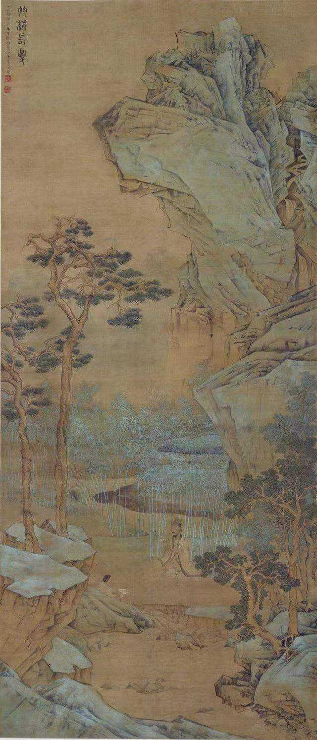 《竹林长夏图》是陆治中年作品,图绘江南夏景。高松竹林之下,一高士正襟临溪而坐,一童相侍,境界清旷幽静。作者借松、竹、石等清高脱俗之物,来颂扬文人士大夫孤高坚贞的情怀和倨傲不群的气度。图中峰峦崖石皴法多用渴、涩之笔,使山石奇峭,棱角分明,用笔简中见工,色彩清丽,是陆治青绿设色画的代表作之一。