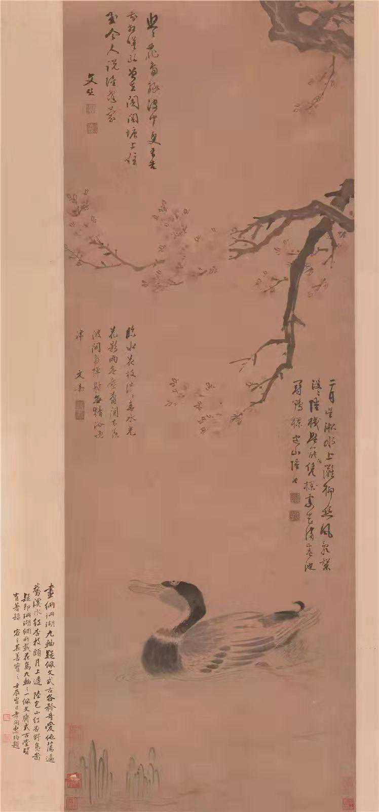 此幅作品,描绘一只野鸭游于水面之上,偏首翘望处,一株杏树从画面顶端垂下,又分为两枝从右至左横穿画面,枝头簇簇粉红的杏花很是惹人怜爱。野鸭的用笔极其简洁灵动,但却描写毕肖,无论是鸭嘴和羽毛的结构,还是双掌拨水的动态,以及歪头时向上仰望的眼神,都相当精彩,活灵活现。笔墨简澹,逸趣横生,看似随意的点染皴擦,实则显示出作者高超的技法和细腻的观察。