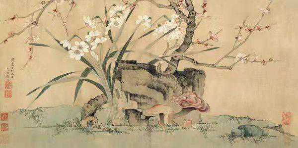 此图为工笔重彩画,受元代钱选画风影响。水仙、梅花、湖石和灵芝,每种相对独立,合之又成为整体,偃仰向背,各具姿态,生动自然。原本略带动势的自然情景,散发着静谧的气息。这是对自然景物的精密观察后再赋予某种韵致加以表达的绘画。在笔法上则注重线条表现力,笔致柔劲,一丝不苟,无论花叶的轮廓,还是叶脉均富于表现力。精工又有士气,精致而不艳丽,细腻而不纤巧,工整而不滞板。设色清雅含蓄,浓淡相宜,细洁光润。是陆治工笔花卉的精品。
