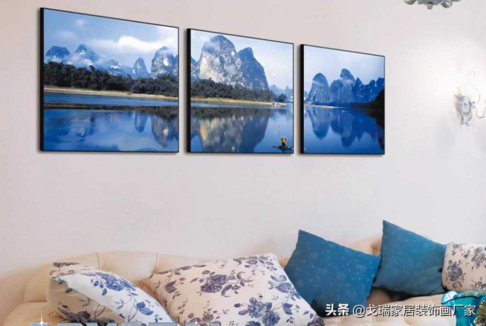 5、悬挂高度:假设可视层高265cm—沙发的高度(欧式沙发110cm左右,现代布艺沙发80cm左右,简约真皮沙发75cm)—装饰画的高度60cm(以此为例),得到剩余空白的高度,然后除以2,空白高度平分,得到的高度再提高10cm左右,得到的高度就是装饰画上边的高度。