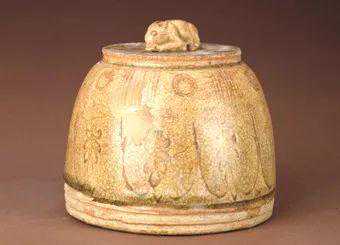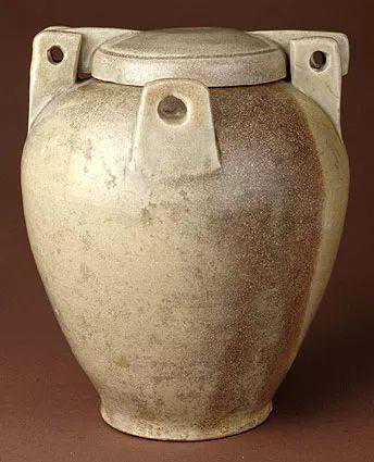 此罐是广州石马村南汉墓出土的4件夹耳盖罐之一。此种夹耳罐的设计取自南方木桶式样,极为别致。罐肩部两侧分别立起一对带孔的方形系,盖的两侧亦各凸出一带孔的长形片,罐盖合时,盖上伸出的带孔的长方形片夹于肩上双系空隙处,一端可系绳作轴,另一端可开启。与此相同造型的夹耳盖罐不仅在浙江越窑及湖南长沙窑的制品中有发现,而且长沙五代墓葬的随葬品中也有出土,可见这种夹耳盖罐在五代时期的江南地区十分流行。