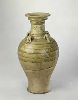 瓶盘口,长颈,溜肩,肩部置四个由双股泥条制成的竖系,鼓腹,腹以下渐敛,近底处外撇。通体施青绿色釉,釉仅及腹下部,釉下施有洁白的化妆土,釉面开有片纹。釉下纹饰为划花和印花,颈、肩部均戳印圆圈纹,肩部有两道划花纹饰,上为覆莲瓣纹,下为忍冬纹,腹部三道划花纹饰,上下均为覆莲瓣纹,中为忍冬纹,每层纹饰间均以弦纹相隔。由于考古工作者在安徽淮南窑遗址曾发现这种四系盘口瓶标本,在安徽地区隋代墓葬中也曾出土这类四系盘口瓶,由此推断,这件四系盘口瓶应为安徽淮南窑制品。