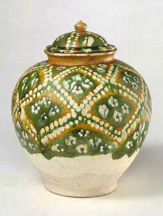 唐三彩陶器是我国古代陶瓷史上的一枝奇葩,是在汉代低温铅釉陶的基础上进一步发展的成果。此件三彩盖罐是唐三彩的代表作,釉彩鲜明亮丽,纹饰仿唐代流行的蜡缬染织物的图案纹样。尤其是此罐器型完整,更为难得。