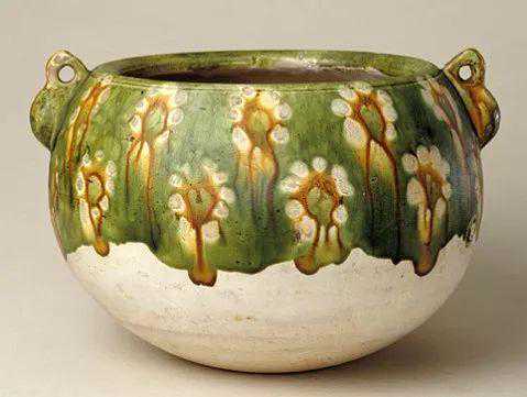 罐呈扁圆形,口内敛,平底,口外两侧各有一系。器内施黄釉,外壁以绿釉为地,上以白、黄、绿三色点染花朵。器施半釉不到底,露胎处呈白色。