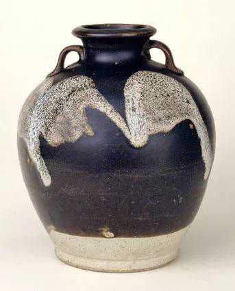 罐口微外撇,短颈,颈两侧对称各置一系,丰肩,肩以下渐收,平底。近底处刻深弦纹一道。通体施黑釉,近底处露胎。乌黑的釉面上装饰四块灰蓝色斑块,似色料自然流淌而成,妙趣天成。
