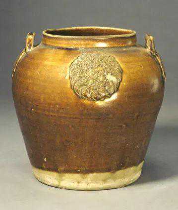 罐唇口,直颈,丰肩,圆腹,腹下敛,平底。胎呈灰白色,器身施褐中泛黄色釉。肩部有对称方形双耳及四朵模印贴花纹。近足处一周及底部素胎无釉。