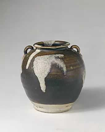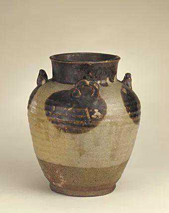 此罐口部外撇,短颈,圆腹,平底。肩部对称置半环形系。罐身施黑褐釉至近足部,上饰月白色斑块。此为唐代著名的花瓷罐。