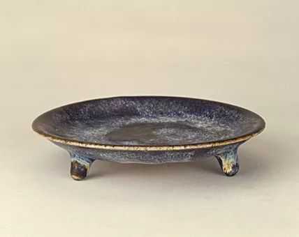 郏县窑黑釉蓝斑三足盘,唐,高2.9cm,口径15cm,足径10.2cm。