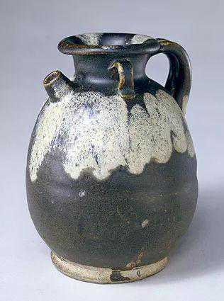 壶撇口,短颈,椭圆形腹,平底,肩部一面为流,相对一面为双带形曲柄,另两面各有一系。通体施黑色釉,里满釉,外部施釉不到底。口、肩等部位施灰蓝色斑纹为饰。