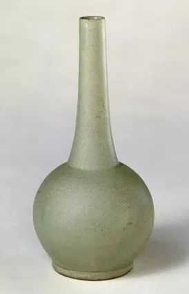 瓶直口,长颈,颈上细下略粗,硕圆腹,圈足。通体施青釉,釉色莹润细腻,发色纯正。