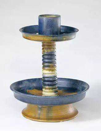 烛台的使用早见于春秋时代,《楚辞》中引“室中之观多珍怪,兰高明烛华容备。”战国时已有各式精制的铜烛台,至三国、两晋时,青瓷烛台便已出现,造型颇多。这件唐三彩烛台造型实用古朴,施釉均匀,色彩深沉雅致,又在三彩中点以蓝彩,更增添了器物的华贵韵致,是三彩器的上乘之作。