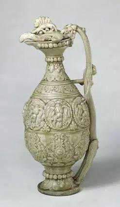 六朝至唐代,我国与西亚各国文化交流频繁,波斯的一种鸟首壶传到我国,影响所及,在唐代的青瓷、白瓷及三彩釉陶中出现了凤首壶,其中以这件青釉凤首龙柄壶最为精美。此壶既吸取了波斯萨珊王朝(226-642年)金银器造型的特点,又融入了我国传统的龙凤装饰艺术,集塑贴、模印、刻花、划花等装饰技法于一体,体现了唐代制