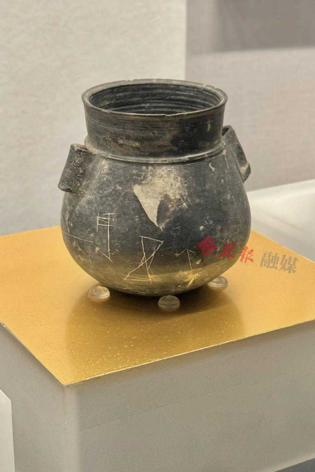 【新石器时代·黑衣陶刻符贯耳罐】