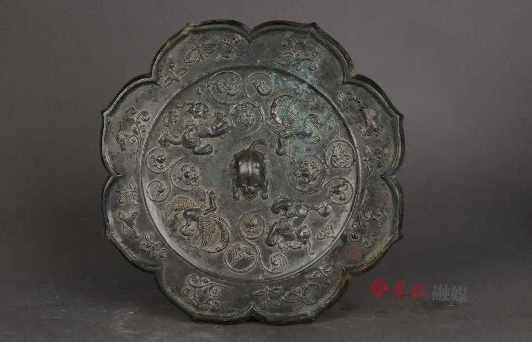 双鸾瑞兽纹铜镜是盛唐时期最流行的镜类,内区饰双鸾双兽,中间还饰有缠枝莲纹,尽显东方之美。