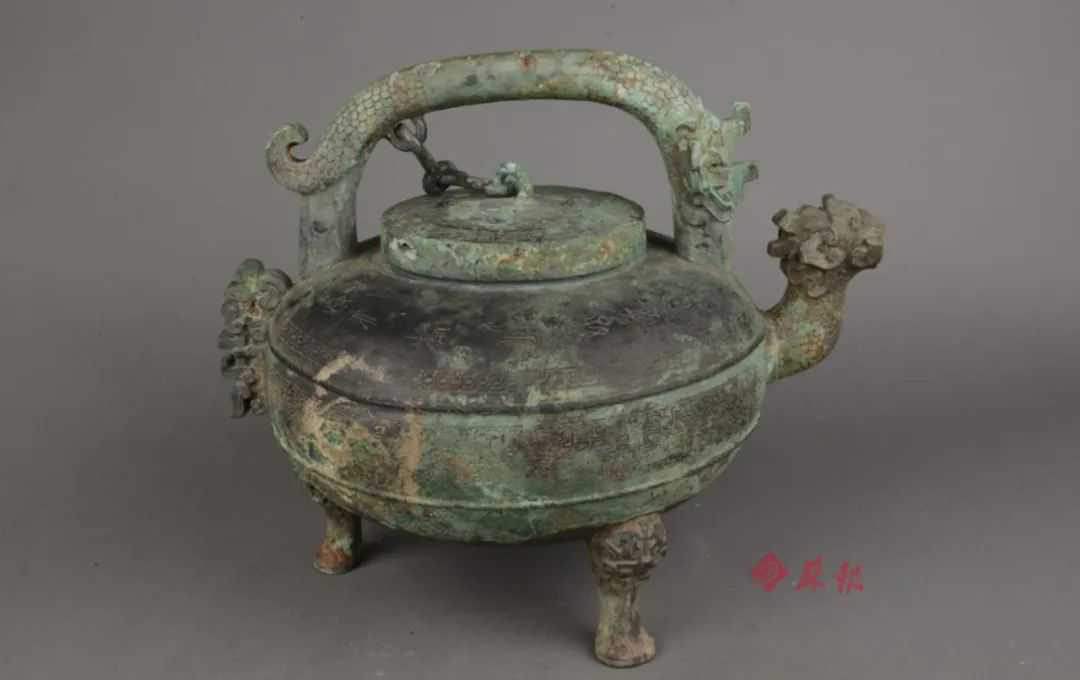 夔龙形提梁是它的显著艺术特点,前有短曲形龙首流,龙首为双目外突,小圆口,头顶铸出扉棱。