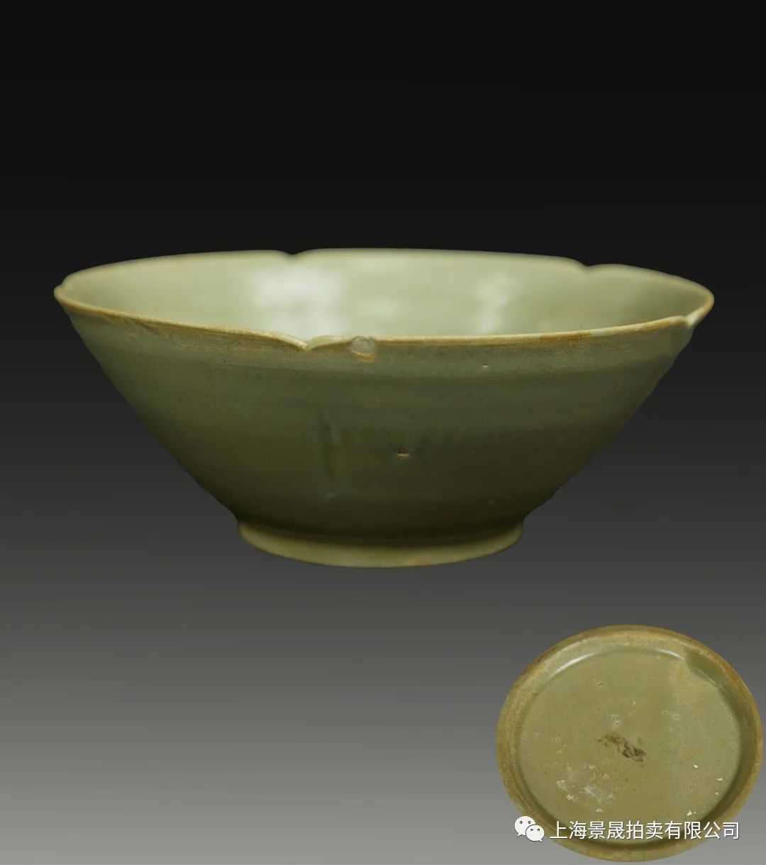 说明:碗作五瓣花形,敞口,弧壁渐收,宽圈足,圈足上有支钉垫烧痕。通体施青釉,釉色青绿,釉面莹润。