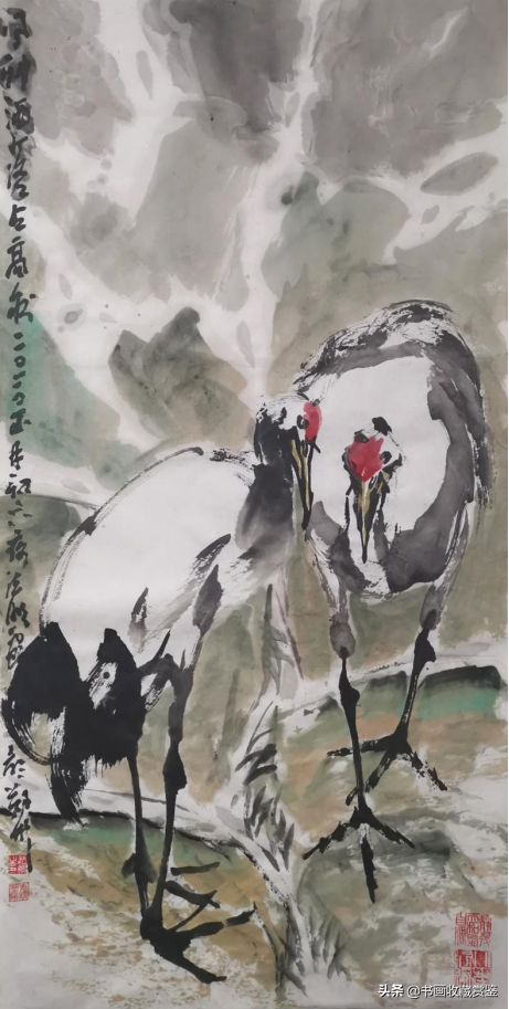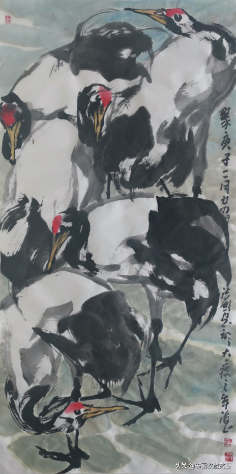 画面中的四只海鹤,立于溪间山石之上,姿态各异,无一重复,仿佛相伴溪间小憩,偶有交流。法鹏先生笔下的鹤静雅高洁,尤以清新、傲洁的神韵著称。他用笔率意,用墨洒脱,寥寥数笔勾勒出主体,用线多以中锋、长线、曲线为主,极具抑扬顿挫之势。他不仅用了国画中的“线”,也用到油画的笔触,加以色彩的融合,其笔力与墨色交相呼应,水墨与色彩互渗,以大块鲜红点染丹顶,一如那诗中的“西施颊”,极少墨线绘出喙、腿、爪,再用两三块重墨随意赋形鹤尾,鹤之灵韵栩栩如生。