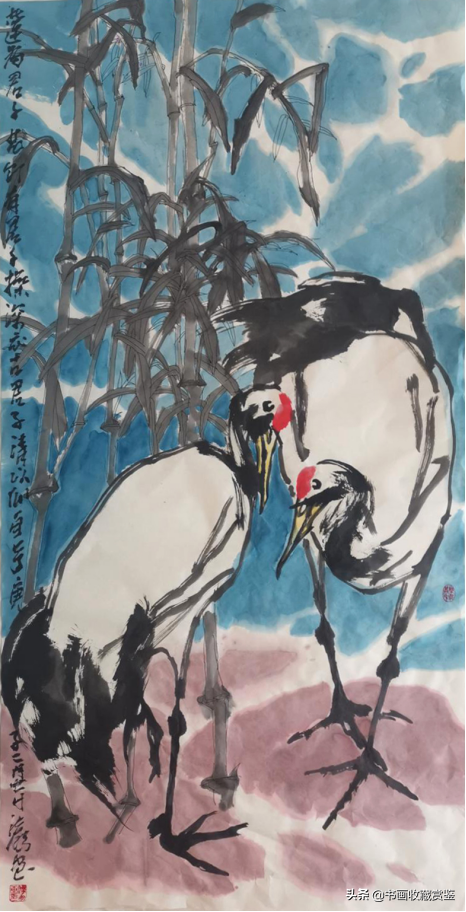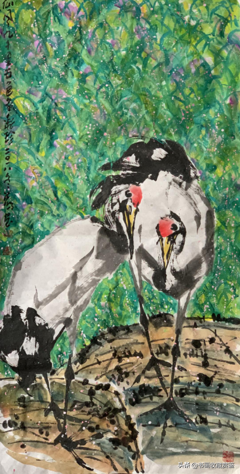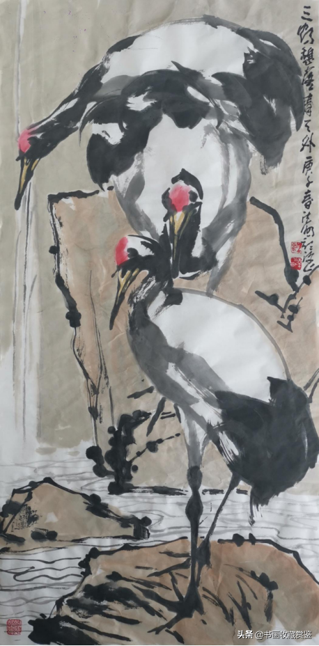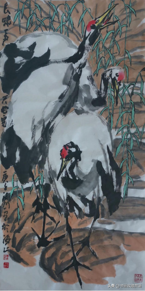 法鹏先生笔下的鹤常三五只出现,在溪边觅食、耳语,“傲”但不“孤”。它们有的婉动长颈,有的侧耳谛听,有的正悠闲栖息,构图完整、大气,尽显传统的笔墨功力、立体的空间画面、大方的生动色彩。