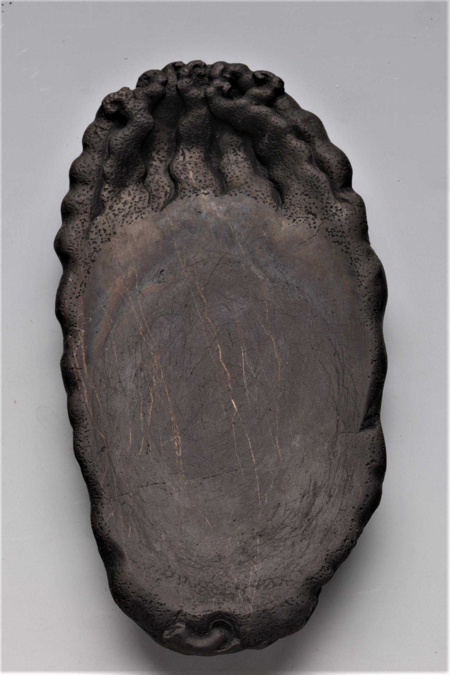 老坑石。砚形如螺蚌,螺身的砚堂可磨墨,螺口的涡形池可用作舔笔。