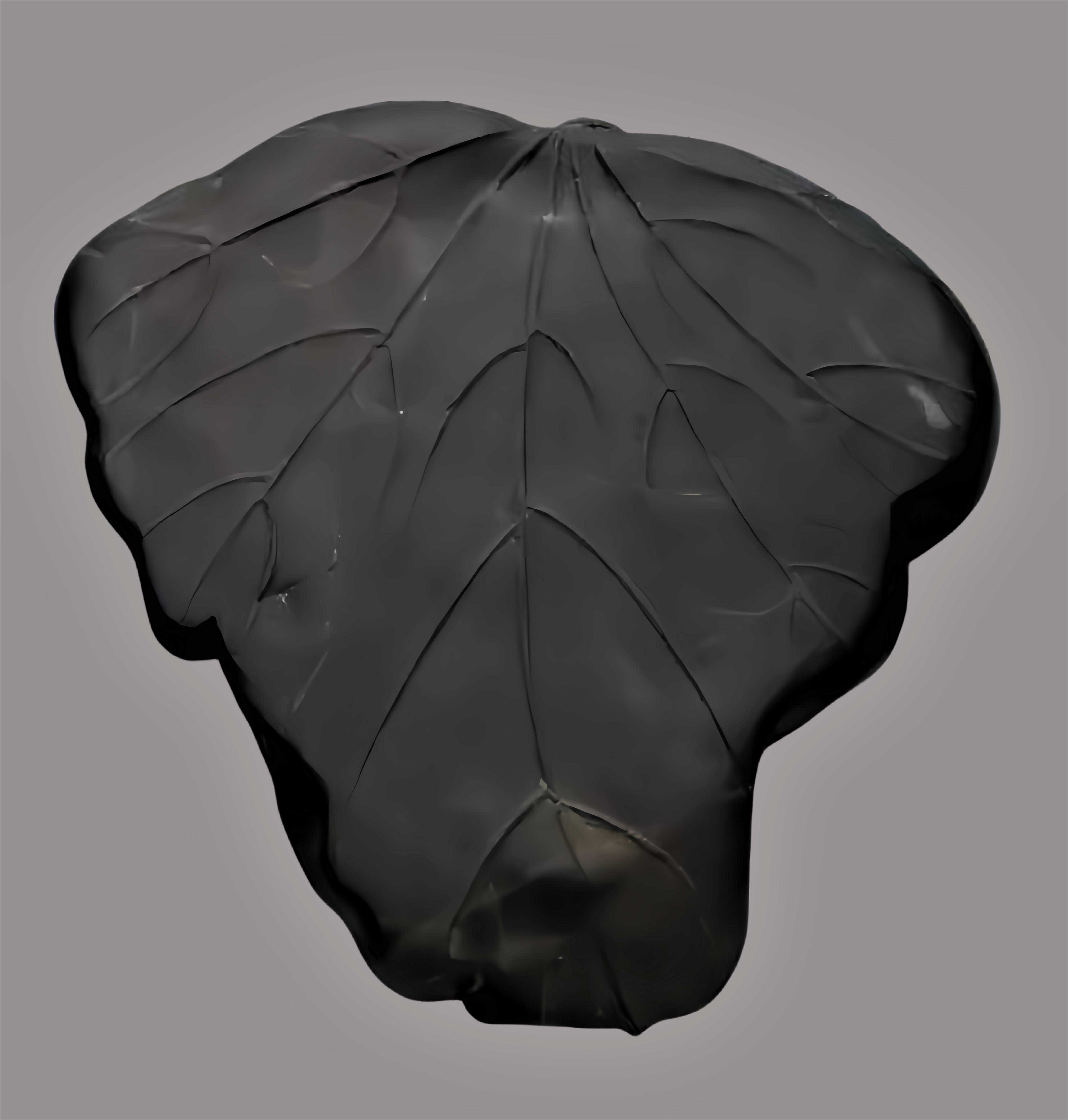 老坑石。石色青灰微带紫蓝而偏蓝。有火捺、玫瑰紫青花、黄龙纹等。随形雕作蕉叶,线条流畅。
