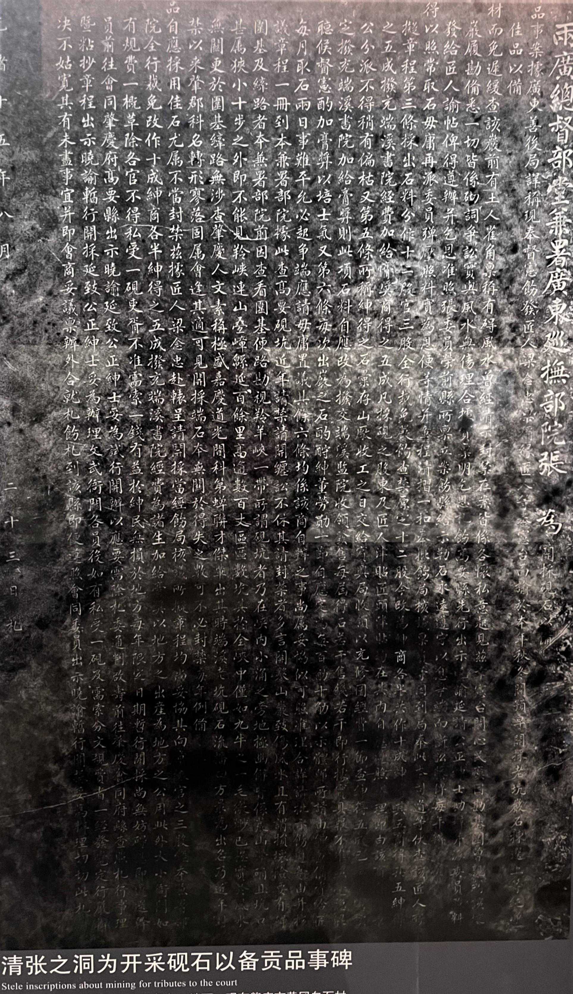 历史上曾数度封坑又数次重开。展厅里就有这样两块内容迥异的碑拓,一块内容是乾隆四十二年(1777年),当地民众以影响灌溉、妨碍风水为理由,不准开采老坑而做的奉禁碑记。另一块的内容则是“张之洞为开采砚石以备贡品事碑”。这块碑刻于清光绪十五年(1889),时任两广总督兼广东巡抚的张之洞,平息了以有碍风水为名,不准开采砚石的争讼,解除封禁,核准石匠开采砚石,并申明将全部砚石开采利润的半数用于营建端溪书院(今广东肇庆中学前身,旧址在府城校区)。碑题“两广总督部堂兼署广东巡抚部院张,为开采砚石以备贡品事按”;落款为“光绪十五年八月二十三日札”。并明令各级官吏衙役不得敲诈勒索,私受一砚一钱。不过现已封坑,自上个世纪90年代末至今没有开采。