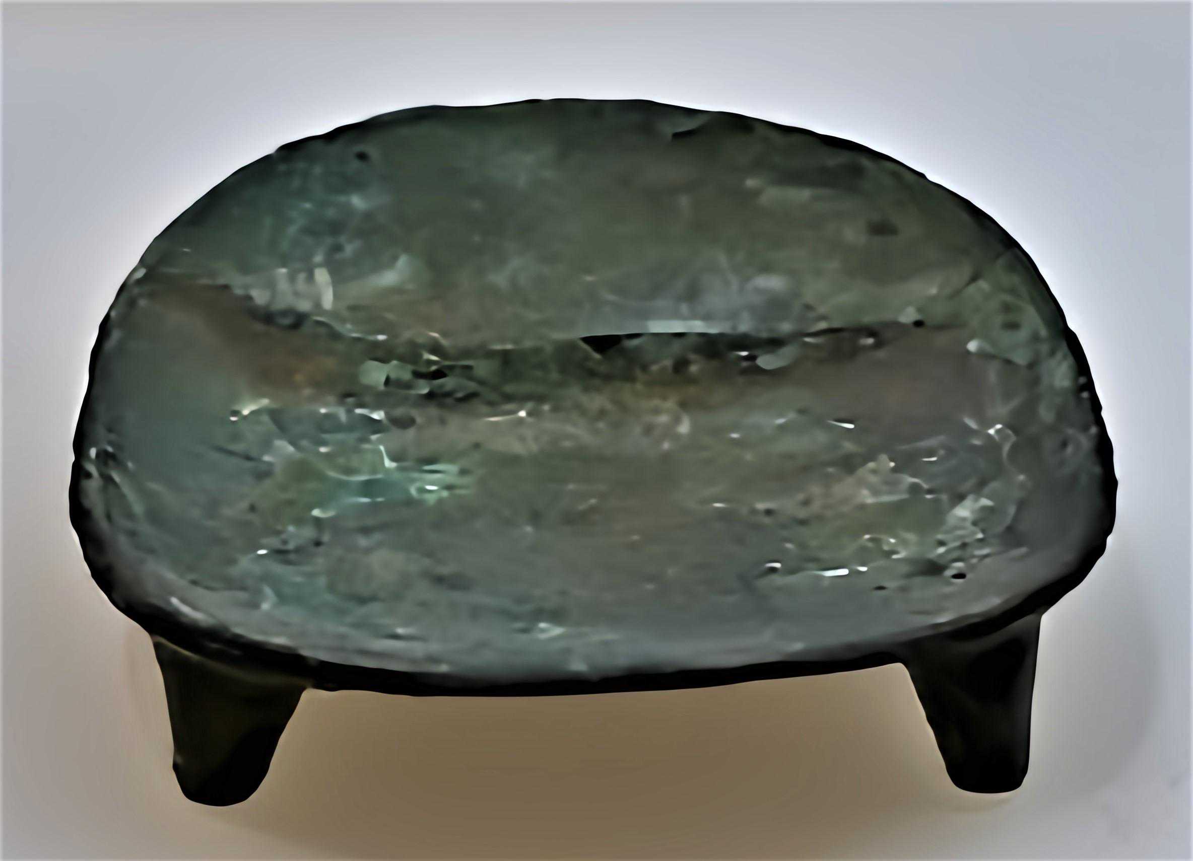 这方陶砚圆形,子母口,平底,下承三足。砚内无釉,内心有多个支烧痕。外施青釉,釉面有细碎开片,釉面莹亮。