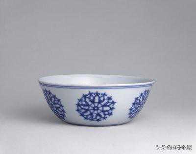 明成化青花宝相花纹卧足碗高3.9厘米口径18.5厘米,此碗腹部绘宝相花。宝相花是佛教崇尚的花卉,寓意超凡脱俗,清纯洁净。