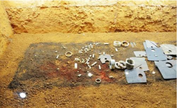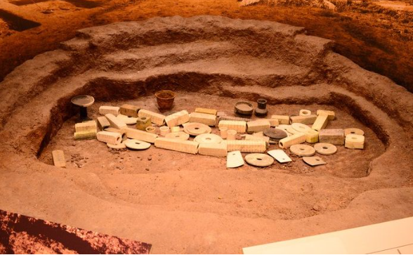 《周礼·宗伯·典瑞》:“疏璧琮以敛尸”。郑玄注曰:“璧在背,琮在腹,盖取象方明神之也,疏琮璧者,通于天地。”这句话是说要使璧、琮上的沟纹下上贯通,象征通于天地。《礼记·郊特牲》:“魂气归于天,形魄归于地,故祭求诸阴阳之义。”古代祭祀和埋葬习俗与阴阳观念有着密不可分的关系。