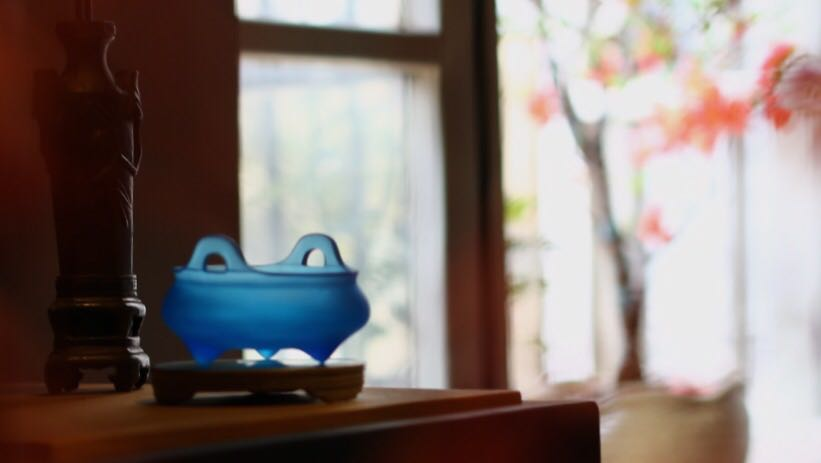 “逸舍”陈列牧之的琉璃藏品:古铜色狮耳炉、宝蓝琉璃药师寸佛、战国蜻蜓眼老琉璃珠、高古水晶珠……牧之发自内心地热爱琉璃,对于他来说,“藏品”不是被束之高阁的高冷玩物,而是生活中朝夕相处的亲切伴随。