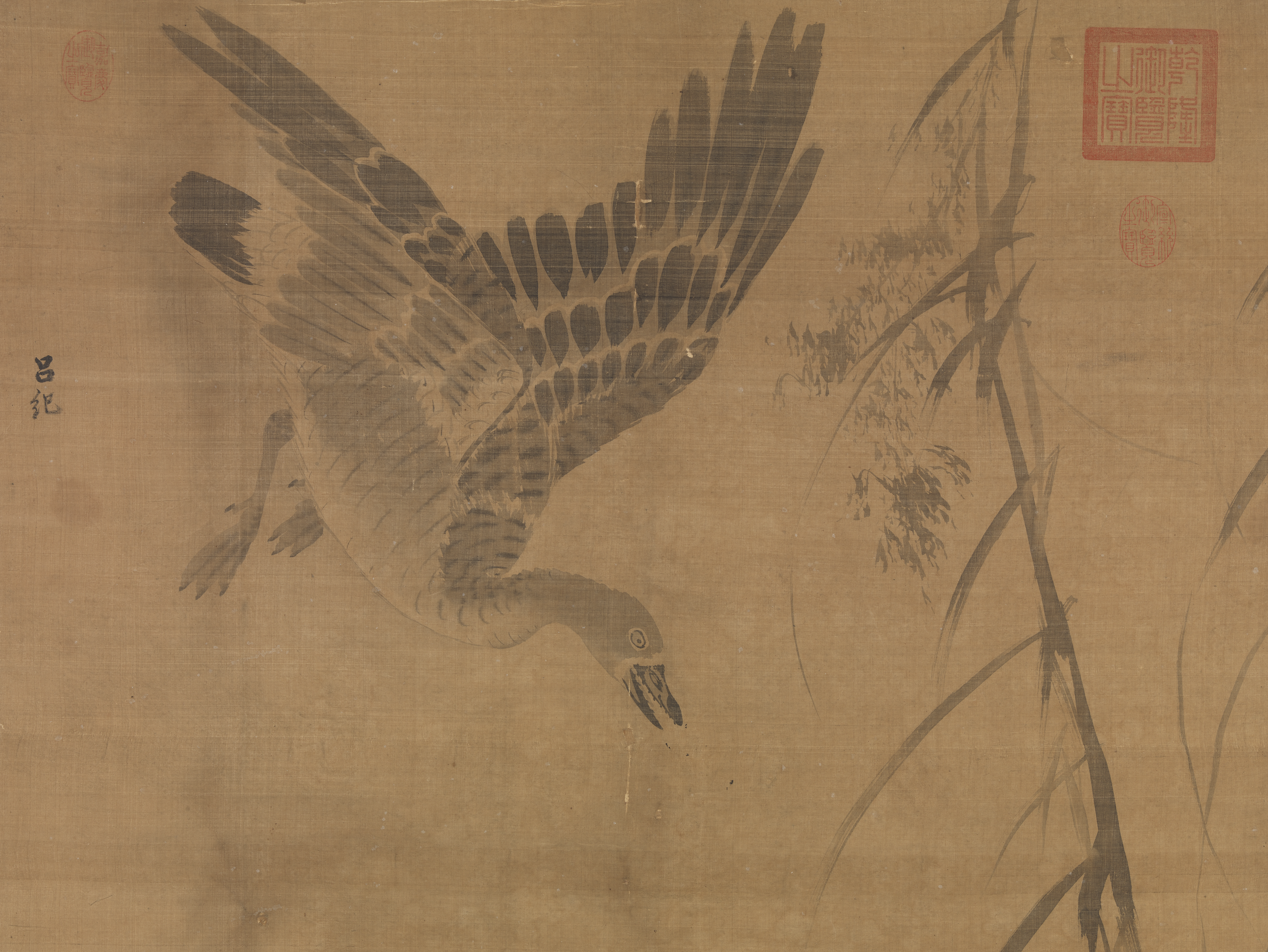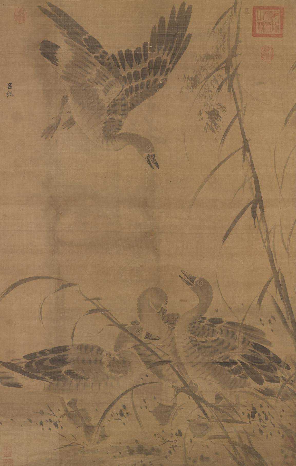 吕纪画风有工笔设色和水墨写意二种。本幅画雁,一飞降,一仰首迎接,四雁结组,颇有呼应。用墨层次,鲜明活泼,于水墨画中是属佳作,但以风格论,无吕纪用笔如风蔌蔌之意。本幅款系后加,右下钤二印,其一“字以善”,是林良字,或出其手,或出其徒,待考。