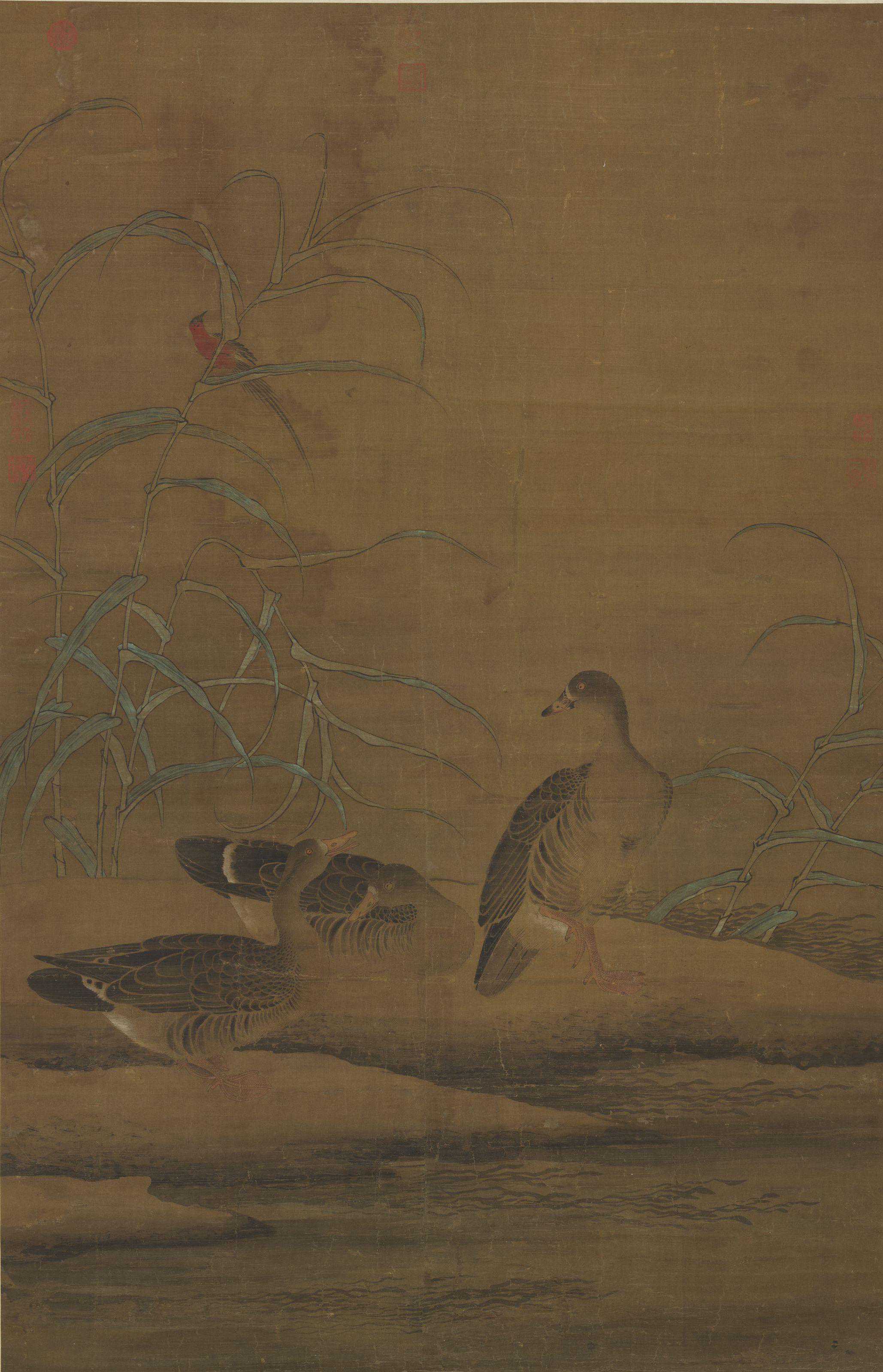崔白以擅画枯荷凫雁而得名,故后人常将此类题材之作品归于其名下,本幅即是一例。构图用笔均简洁的坡岸、芦雁,与崔白写实的笔墨风格不相类,却有着元代古拙朴质的感觉。