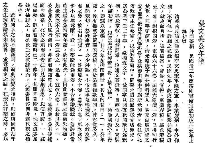 是记署“中华民国二十八年十二月”,张仁蠡时为汪伪武汉特别市政府市长,在武汉将许同莘此前“投赠好友”之油印本付梓。书前许氏自序,交代此编“自草创迄于写定,凡五易其稿”,并述为其所“景慕”之张文襄公作谱,无论出于公义私谊,均属责无旁贷:“考其身世、叙次其文章事业,以寄低回想往之思,虽未必合于古人,而论者有取焉。况亲炙其人,得见其行事,而怵于著书之难,不及其时,荟萃考订,以成一编,是便私图负知己,而非公义所宜出也”。后出之商务版,文字、体例一仍前版,全书共十卷,以张之洞生平事业之段落为分卷准则,大字提纲,小字附注,其事不能纯以年月区别者,则附入各卷之末。
