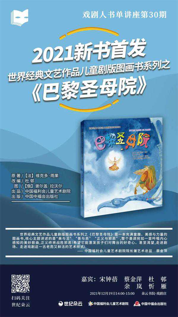 “世界经典文艺作品儿童剧版系列”是中国福利会儿童艺术剧院自2015年来重点打造的作品,该系列从《泰坦尼克号》《巴黎圣母院》再到《悲惨世界》,展示了经典不被岁月消磨的巨大文化价值。最近,《巴黎圣母院》图画书也问世了。12月19日下午,宋钟蓓、蔡金萍、杜邨、余岚、忻雁将齐聚朵云书院·戏剧店,畅谈《巴黎圣母院》文字内外、舞台上下的点滴精彩。