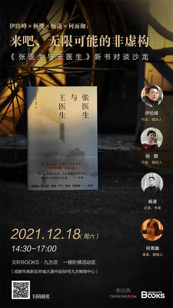 12月18日,我们邀请到作家、媒体人——伊险峰、杨樱带着他们的新书《张医生与王医生》与作家杨潇、译者何雨珈,空降文轩BOOKS九方店,来一场无限可能的非虚构的对谈沙龙,与读者朋友们一起思考和讨论书中所提到的诸多问题:阶层跃迁、城市命运、社会转折,一起回顾这过山车般的光怪陆离、充满变迁的三十年。