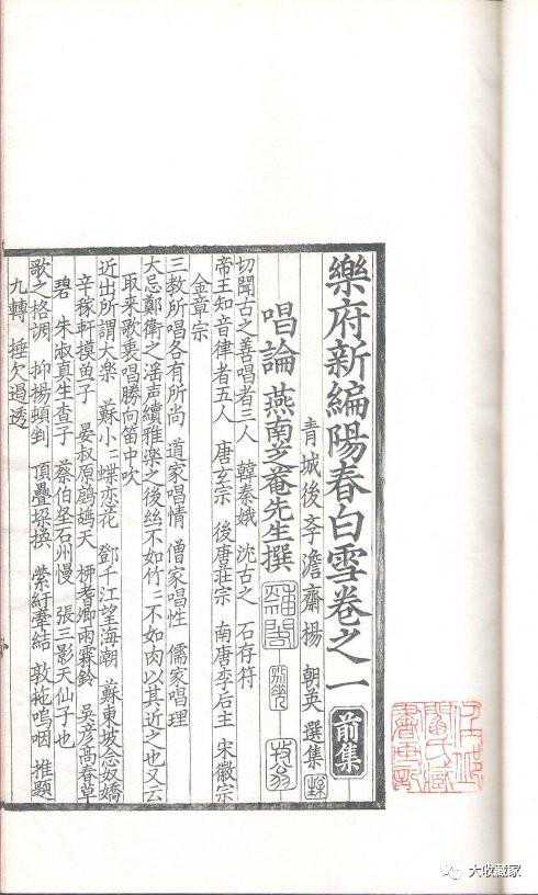 光绪乙巳徐乃昌小檀栾室影假泉唐丁氏善本书室藏元刻本《乐府新编阳春白雪》,属室人怀宁马韵芬景写校梓,《随庵丛书》之一。