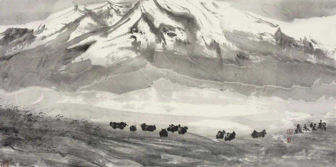这些作品都传达出一种摄人魂魄的大气派,使人不由自主地感受到一种人与自然合而为一的伟大力量,心中由衷兴起雄奇野性、苍凉悲壮和高山仰止的敬畏之感。在近现代时期以来,中国画的卓越成就包括了语言风格和笔墨运用的更新、绝不止于艺术语言和风格技巧的层面,而是突显于精神内涵的拓广与深入。蒋志鑫先生穷究奥秘的雪域和大漠荒原的创作,史诗般的倾泻出荒原雪山的神圣和遥远大荒的崇高,有力的拓展了中国画艺术表达的精神领域。
