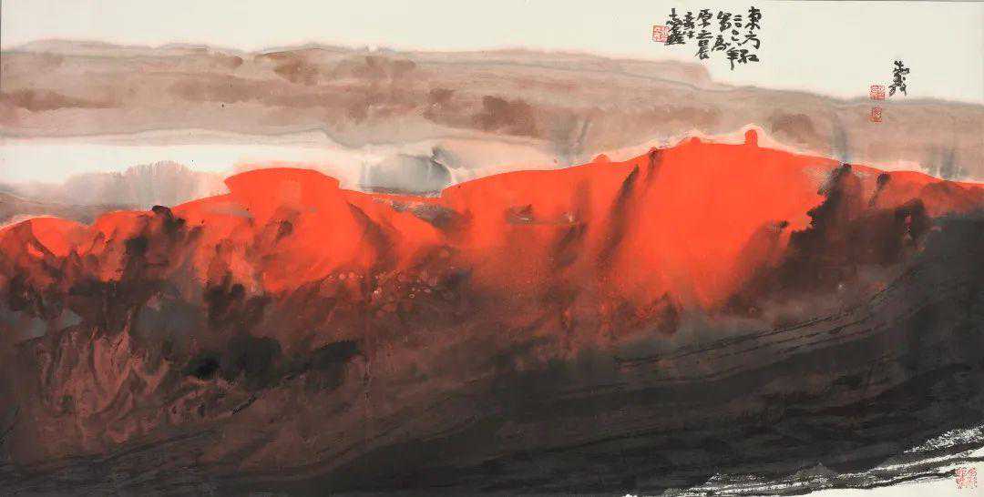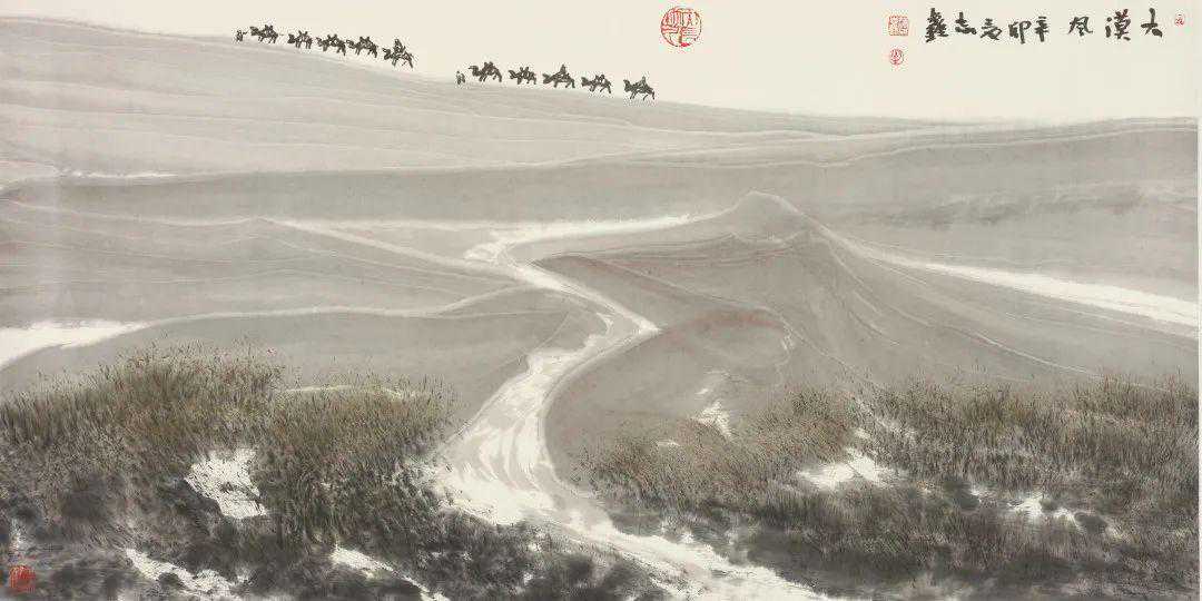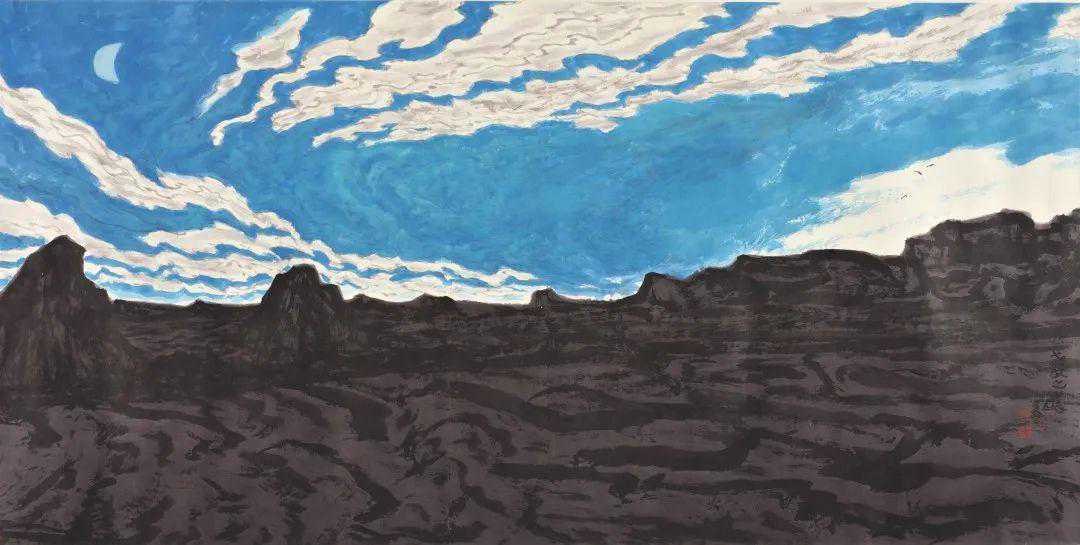 四十年中,先生每个时段的画作我都能熟悉于心,历历在目。先生对穷究大荒的奥秘,已步入一种神化的状态,进入物我幻化的一种易象创造境界。运用他特有的形式组合,结构胸中潜像,运用他特有的笔墨语言,揭示他内心深处的精神意念。在他的山水画创作中,从早期的写意陇东到逐步走进表现西域旷野的运化奇观;在混茫与冥冥的画境中蕴含了他对神奥和宗教的虔诚。